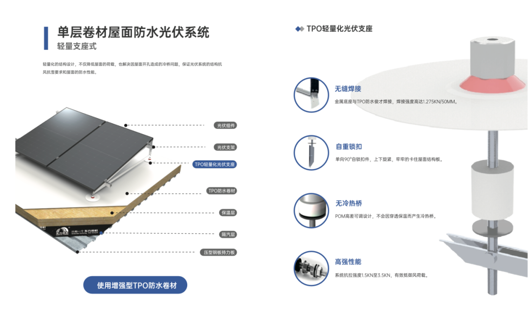 综合厂房屋面实际情况,本次项目采用虹昇新能源TPO单层卷材屋面防水光伏系统。该方案是在厂房屋面原有东方雨虹TPO单层屋面系统上加装光伏系统。其中,TPO防水卷材与TPO光伏基座上方加装的特殊可焊接金属板,通过热风焊接进行连接,不仅能够确保锚固件穿透防水层,还能够利用热风焊接,将屋面TPO防水卷材和光伏支座焊接,保证屋面整体防水效果和使用寿命不受影响;其上安装的晶澳N型双面双玻575W组件,能够将更多的太阳能转化为电能,从而有效提高发电量。