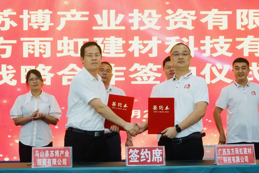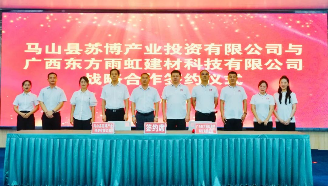 2024年7月25日,东方雨虹与马山产投在马山现代种业科技创新中心举行战略合作框架签订仪式。马山县苏博产业投资有限公司董事长黄仕立、总经理黄传刚、副总经理韦灵姣,东方雨虹工建集团战略投资部总监滕飞、广西东方雨虹建材科技有限公司总经理罗鹏军等相关负责人参加签约仪式。