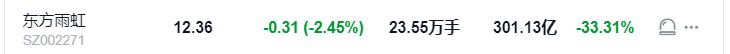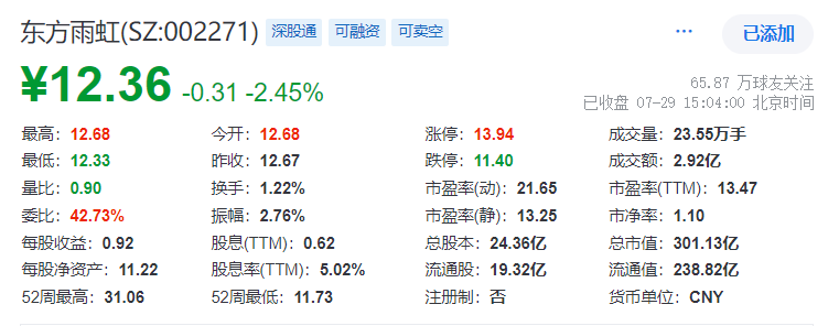 截至7月29日,东方雨虹股价跌2.45%,报12.36元,总市值为301.13亿元。数据显示,东方雨虹股价年初至今已跌33.31%。