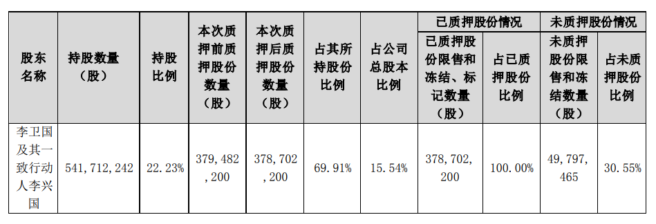 李卫国及其一致行动人李兴国合计持有公司股份5.42亿股,占公司总股本的22.23%,完成本次部分股份质押展期、质押及解除质押后,累计质押所持公司股份为3.79亿股,占公司总股本的15.54%,占其所持公司股份的69.91%。而李兴国为李卫国弟弟。