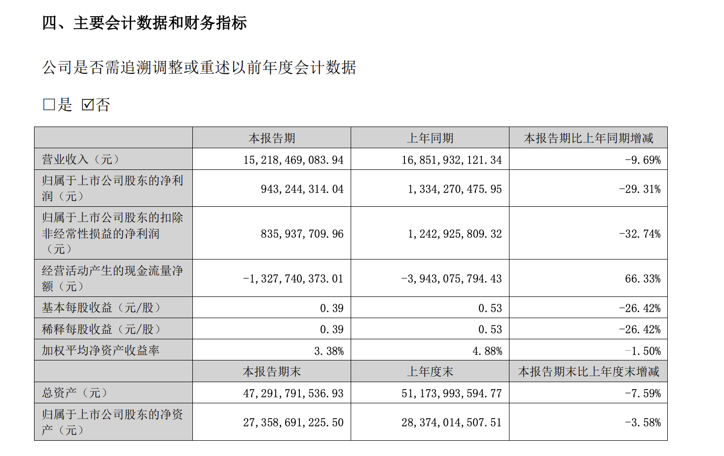 截至今年上半年,公司实现营业收入152.18亿元,同比下降9.69%;归属于上市公司股东的净利润9.43亿元,同比下降29.31%;扣除非经常性损益后的净利润为8.36亿元,同比下降32.74%。