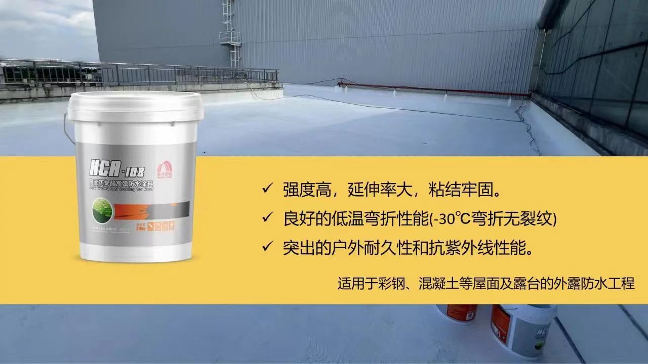 广州气候条件复杂多变,强降雨及高温天气偏多,这无疑将对建筑屋面构成严峻挑战。作为本次项目防水隔热系统解决方案的核心材料之一,HCA-108屋面丙烯酸高弹防水涂料正是应对挑战的利器。该涂料以优良的弹性、耐候性和防水性能著称。经过均匀涂刷后,涂料能形成一层连续无缝的防水膜,与屋面结构紧密结合,从而有效抵御雨水、紫外线等侵害。