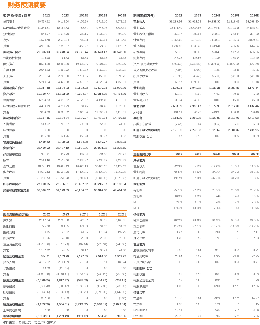 公司24Q1-3实现收入217亿,同比-14.4%,归母、扣非净利润分别为12.77、10.99亿,同比-45.7%、-49.4%;Q3单季实现收入64.8亿,同比-23.8%,归母、扣非净利润分别为3.34、2.63亿,同比-67.2%、-71.7%;前三季度非经常性损益为1.79亿,同比-0.03亿。三季度利润大幅下滑我们判断主要系毛利率小幅下滑,费用率提升,减值损失增加以及政府补助减少所致。