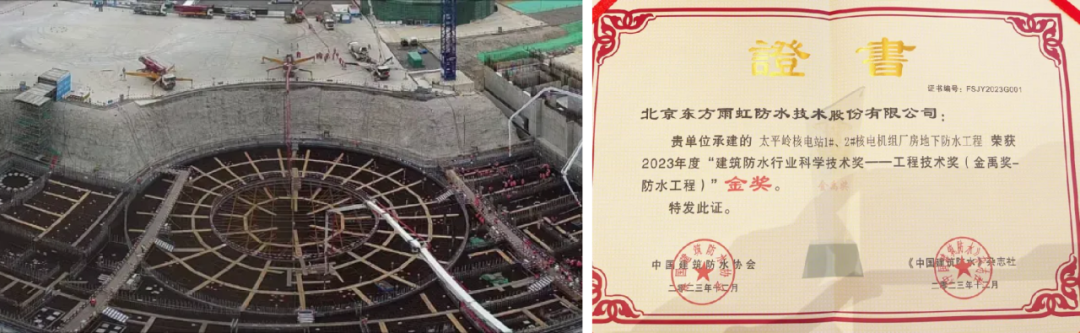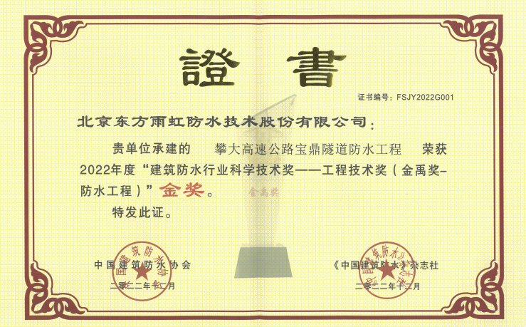 六年斩获五金,尽展品质实力。这是东方雨虹继2019年“北京市南水北调东干渠项目”、2021年“北京地铁15号线项目”、2022年“攀大高速公路宝鼎隧道”、2023年“太平岭核电站1#、2#核电机组厂房地下防水工程”后,第五次获得“金禹奖”金奖。不仅充分展现出该材料过硬的产品性能、服务质量,以及在市政输水隧洞、地铁、公路、核电等不同应用场景中的高适应性,更进一步彰显出行业、客户对东方雨HDPE高分子自粘胶膜预铺防水卷材专业实力与品质服务的高度认可。