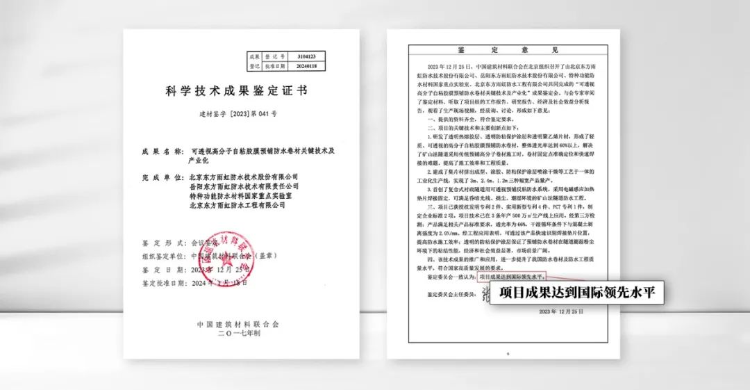 东方雨虹可视化HDPE高分子自粘胶膜预铺防水卷材聚焦于山岭隧道、暗挖洞库、市政地下廊道、地铁车站等光线不足的地下工程防水应用场景:卷材透明、轻质,整体透光率达到60%*以上,不仅能够高效应对隧道高海拔、大埋深等地质复杂的应用场景,更能够满足昏暗条件下卷材固定点准确定位和快速焊接的应用需求。目前,“可视化HDPE高分子自粘胶膜预铺防水卷材关键技术及产业化”研究项目已获得科学技术成果鉴定证书,中国建筑材料联合会鉴定委员会评定:该项目成果达到国际领先水平。