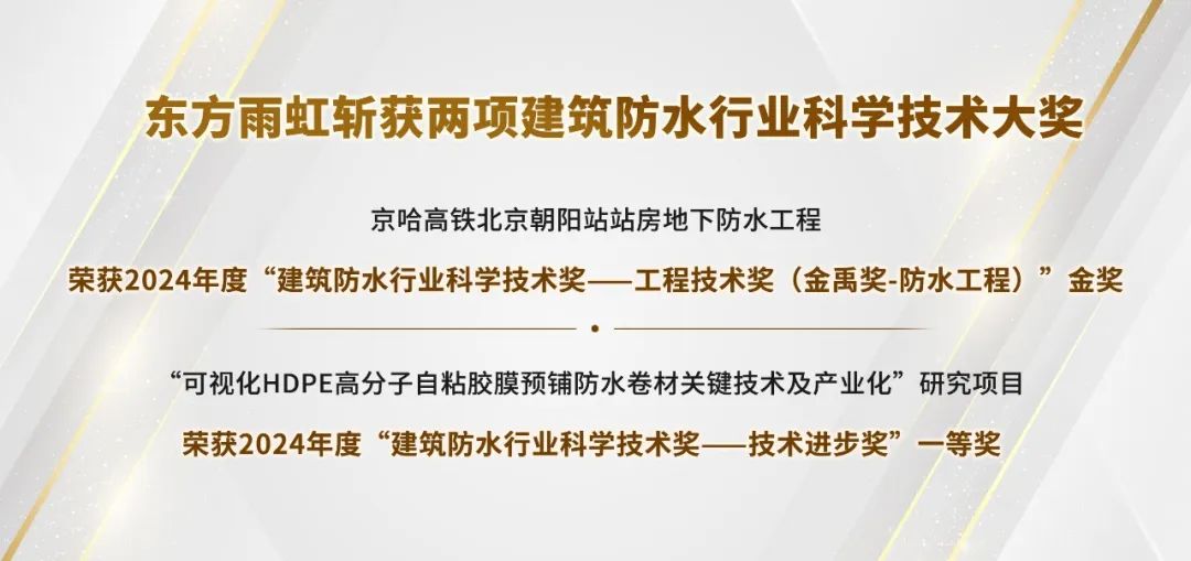 硕果载荣誉,砥砺再出发。面向未来,东方雨虹将以此荣获两项建筑防水行业科学技术大奖为契机,充分发挥科创平台、产业基础及资源优势,在持续提升、完善HDPE高分子自粘胶膜预铺防水卷材及配套系统解决方案的同时,全力为交通基建、市政建设等更多工程项目建设提供高质量、全方位的专业服务与安心守护。