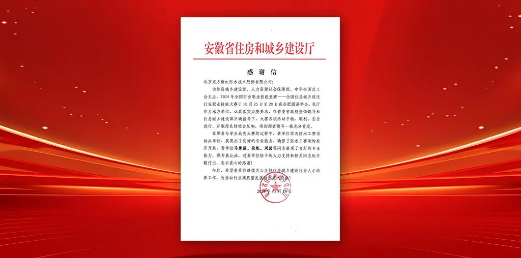 近日,东方雨虹收到一封来自安徽省住房和城乡建设厅的感谢信,对东方雨虹及马勇强、段炼、周园等同志在2024年全国行业职业技能竞赛——全国住房城乡建设行业职业技能大赛期间作出的积极贡献给予高度肯定与赞扬。