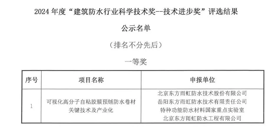 此外,凭借在产品品质、节能环保、服务质量、应用效果、多场景应用适应性等综合性能优势,东方雨虹HDPE在众多领域中展现出强大的技术实力。2024年,东方雨虹以HDPE高分子自粘胶膜预铺防水卷材及系列配套系统解决方案为支撑,积极探索、创新突破,将建筑建材系统服务思维、产品性能特点与数字技术深度融合,推出全新“可视化HDPE高分子自粘胶膜预铺防水卷材关键技术及产业化”研究项目,并一举斩获2024年度“建筑防水行业科学技术奖——技术进步奖”一等奖。