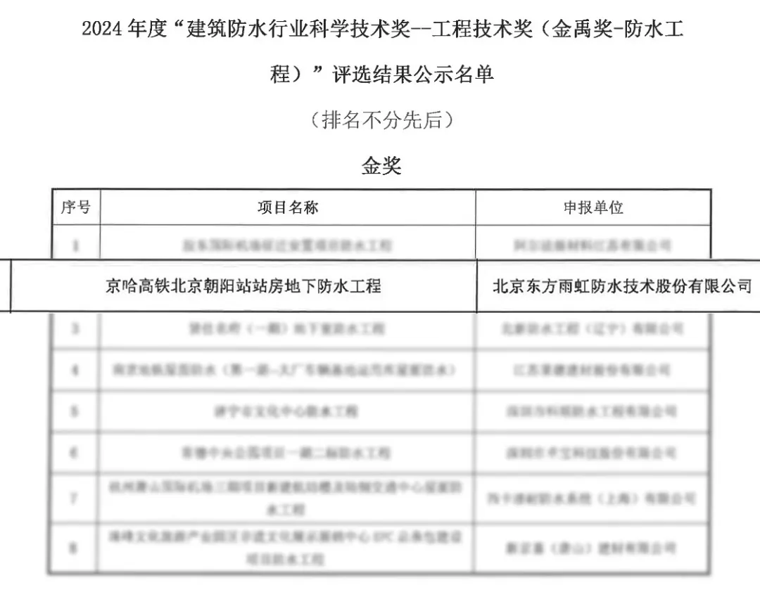 在2024年建筑防水行业科学技术奖两大奖项评选过程中,东方雨虹第五次凭借HDPE高分子自粘胶膜预铺防水卷材的良好应用及创新技术拔得头筹,荣获“工程技术奖(金禹奖-防水工程)”金奖及“技术进步奖”一等奖。不仅充分展现出该卷材过硬的产品性能、服务质量,以及在市政输水隧洞、地铁、公路、核电等不同应用场景中的高适应性,更进一步彰显出行业、客户对东方雨虹HDPE高分子自粘胶膜预铺防水卷材专业实力与品质服务的高度认可。