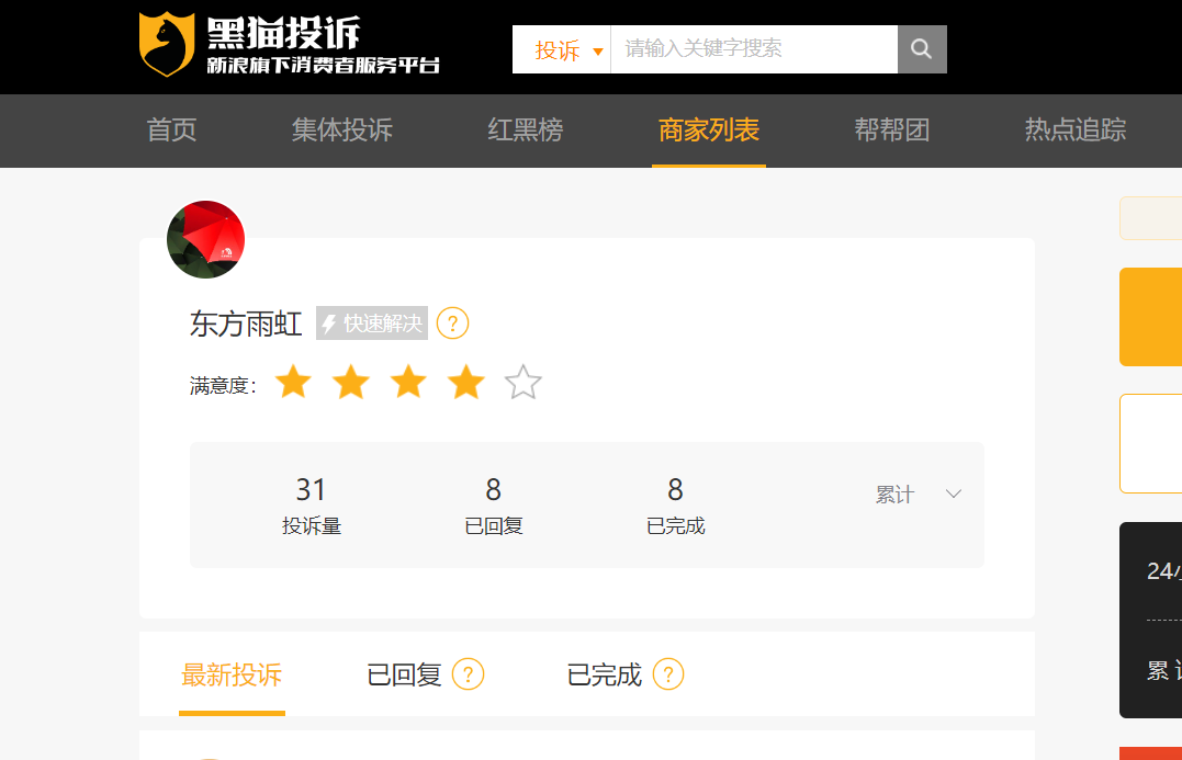 乐居财经李兰据黑猫投诉平台,截至2月12日,东方雨虹累计投诉量为31起,已完成8起,投诉完成率为26%。