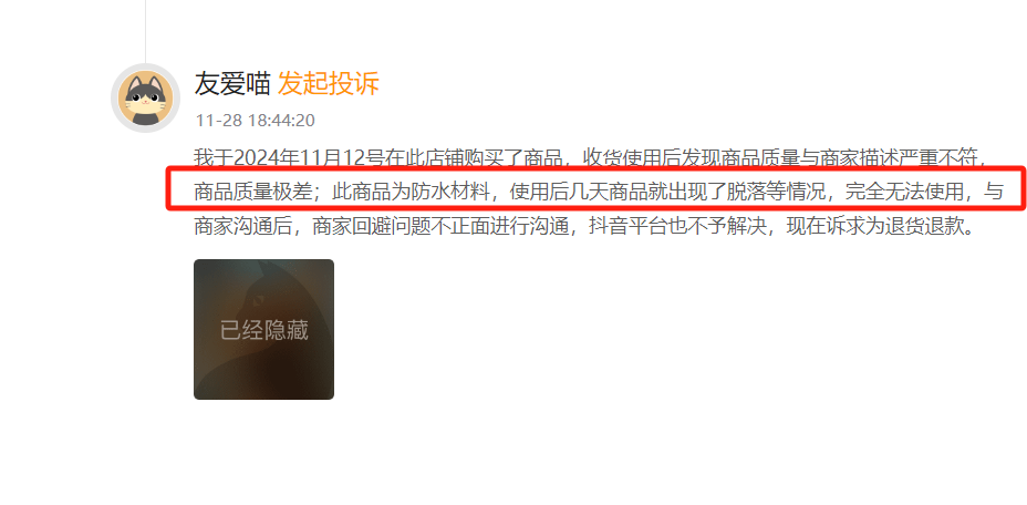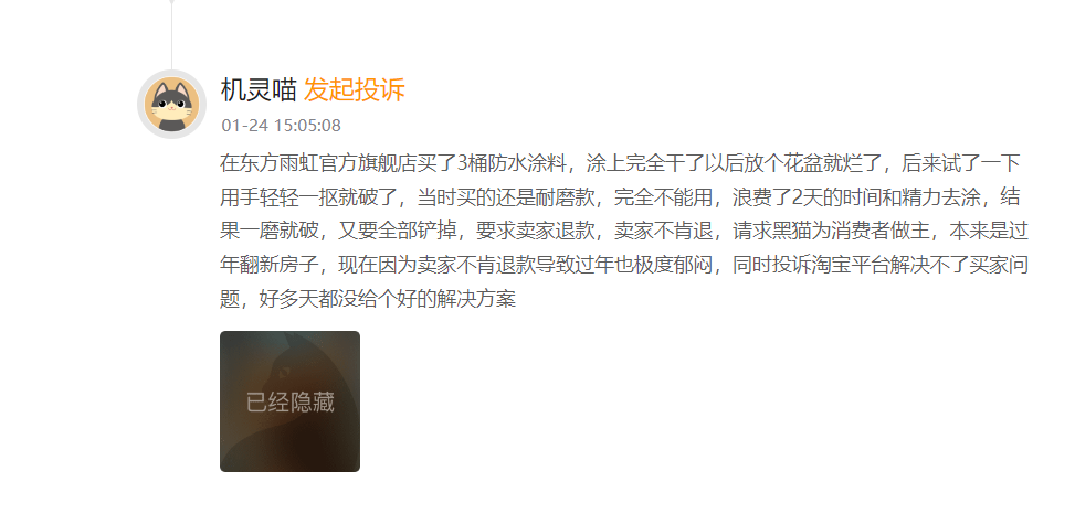 此前,也有消费者因为防水材料质量问题发起投诉。消费者投诉称,其于2024年11月12号在东方雨虹官方旗舰店购买了防水材料,使用后几天就出现了脱落等情况,完全无法使用,与商家沟通后,商家回避问题不正面进行沟通,抖音平台也不予解决,其诉求为退货退款。