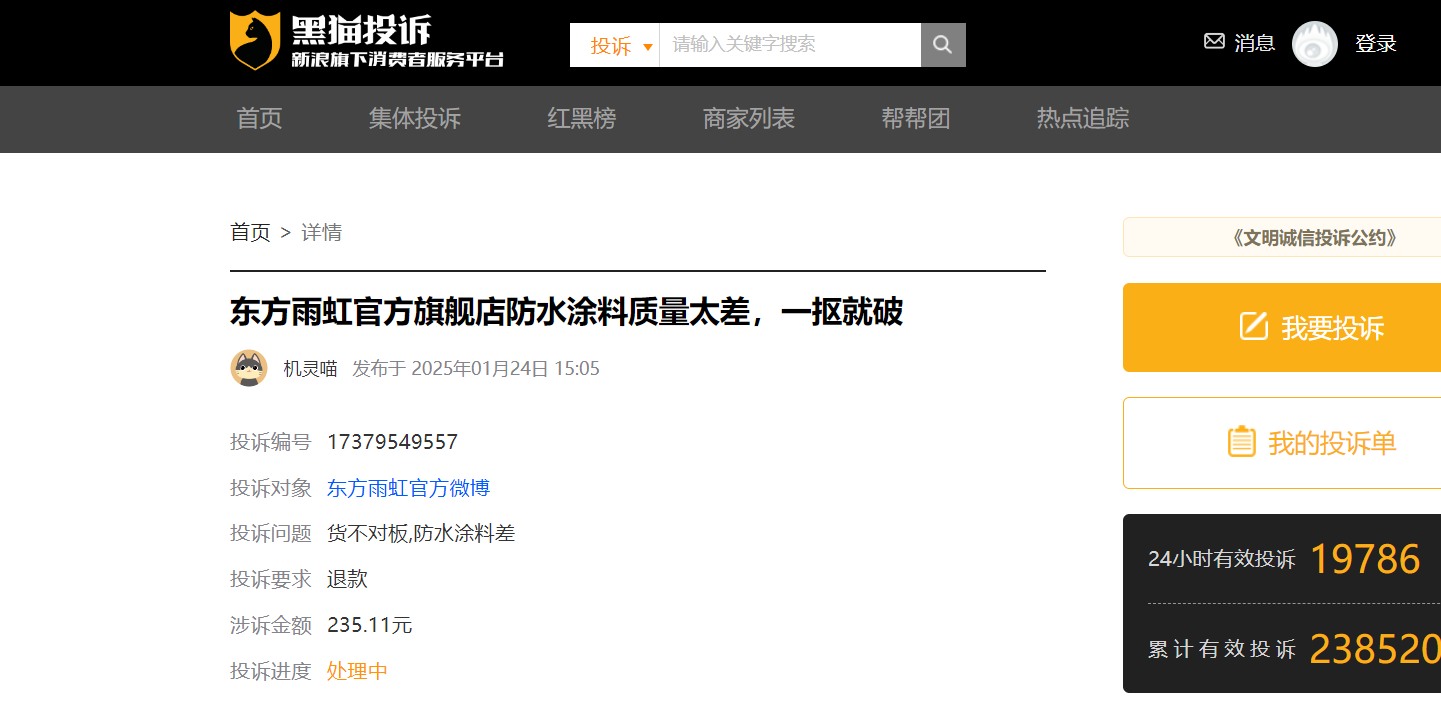 东方雨虹防水涂料遭质量投诉,平台投诉完成率仅26%