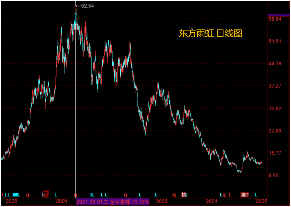 然而,事与愿违,随着持股计划的发布,东方雨虹股价一路暴跌。从2021年最高点62.54元/股跌至2025年2月21日的12.58元/股,员工持股计划跌幅超过了70%,理论上总亏损超20亿元。若仅计算员工自筹资金部分,本金亏损已超过100%。
