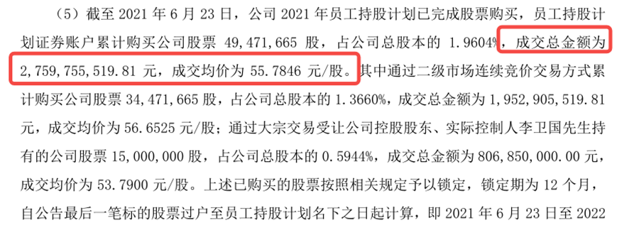 东方雨虹实施的员工持股计划,也出现巨大的浮亏。具体来看,2021年3月,东方雨虹推出员工持股计划,旨在激励员工,提升员工的归属感和积极性。1411名员工自筹资金13.77亿元,并通过1:1杠杆融资,合计投资27.6亿元,以均价55.78元买入4947万股。控股股东李卫国承诺,若员工自筹资金年化收益率低于8%,他将兜底本金并补偿利息。