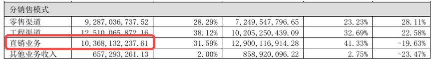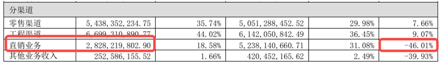 直销业务一直是东方雨虹重要的销售模式。在2023年,直销业务还是其第二大销售模式,收入超过100亿元。但到了2024年上半年,直销业务收入锐减46%,仅为28亿元左右。