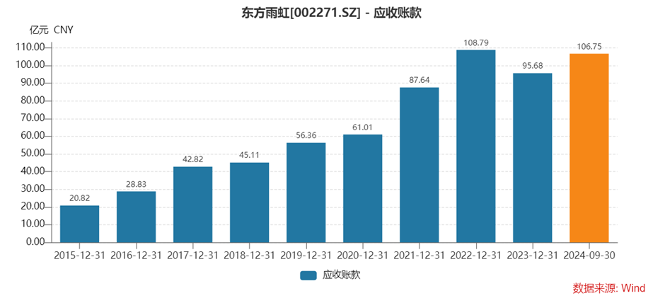 最为直接的便是东方雨虹高悬的应收账款问题。截至2024年三季度末,公司应收账款高达106.75亿元。