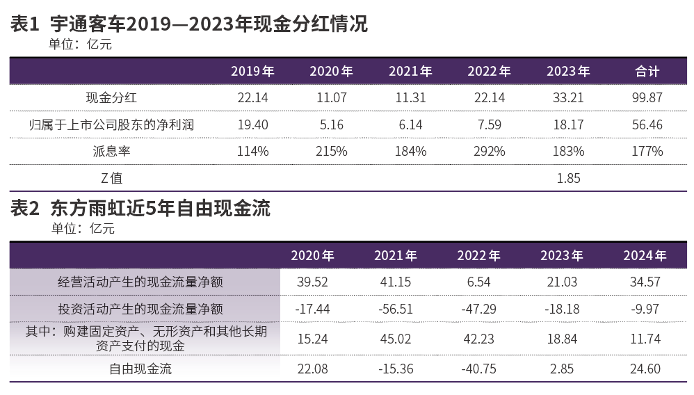 宇通客车2019年至2023年期间,每年的派息率均超过100%,平均为177%。尤其是2020年,公司实现归属于上市公司股东的净利润5.16亿元,同比减少了73.43%,却依然分红11.07亿元。虽说宇通客车当年净利润的下降幅度低于东方雨虹(2024年下降95.24%),但东方雨虹归属于上市公司股东的扣除非经常性损益的净利润仍有1.24亿元,而宇通客车当年扣非净利润已经是-0.55亿元了。有意思的是——在那以后,宇通客车并没有因为那一年看上去不太合理的高分红而深受其害,日子反而越过越红火了。