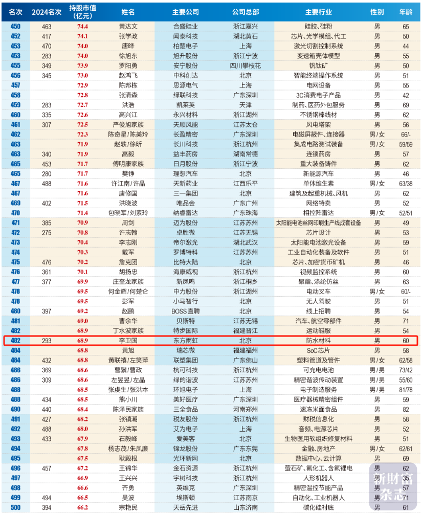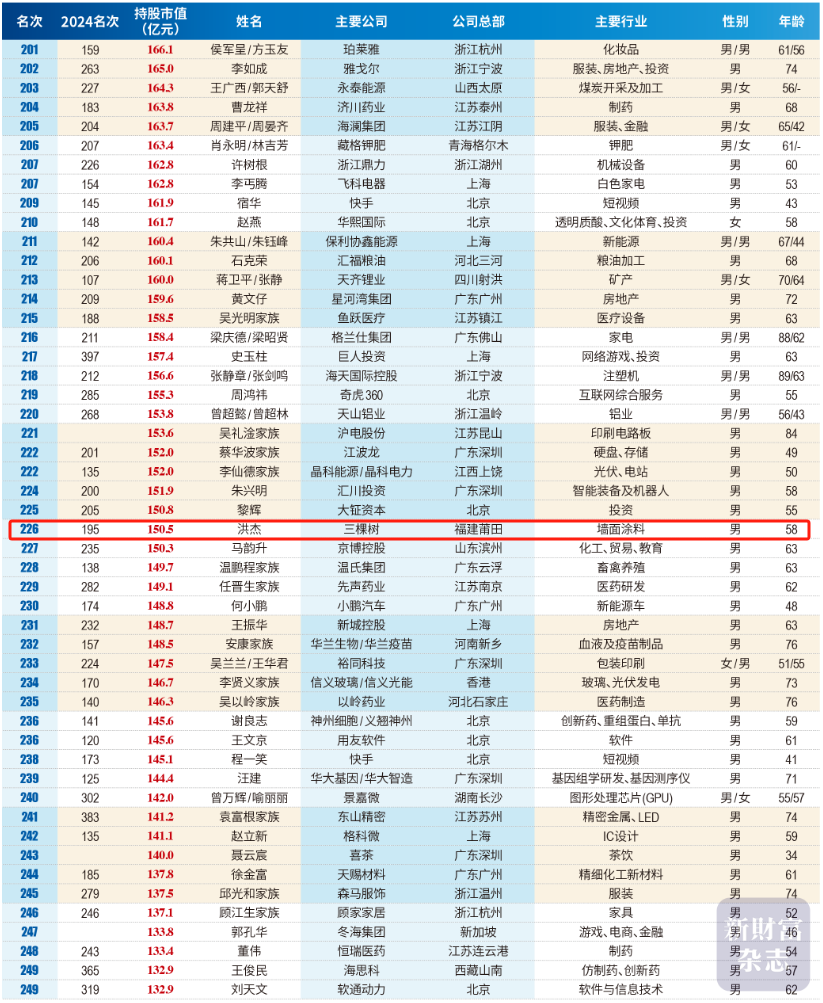 值得一提的是,涂料行业有:三棵树洪杰/东方雨虹李卫国上榜。其中,三棵树洪杰以持股市值150.5亿元位列榜单226位,东方雨虹李卫国以持股市值68.9亿元位列榜单482位。这不仅是他们个人财富实力的彰显,更映射出行业头部企业的雄厚底蕴与强劲发展动能。