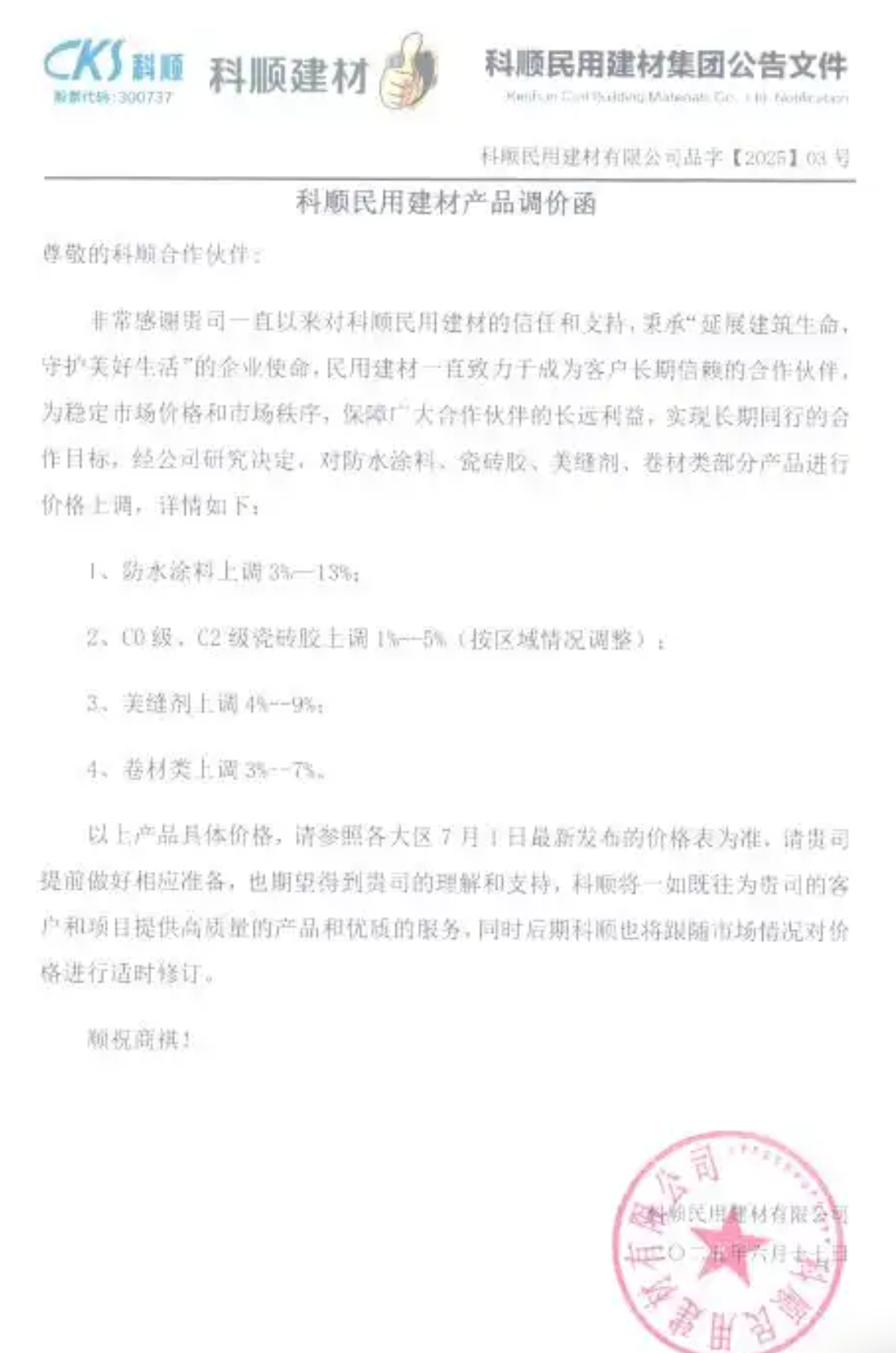 今日,科顺股份的全资子公司科顺民用建材有限公司也发布了相关调价函,表示为稳定市场价格和市场秩序,保障广大合作伙伴的长远利益,实现长期同行的合作目标,经研究决定,对防水涂料、瓷砖胶、美缝剂、卷材类部分产品进行价格上调。
