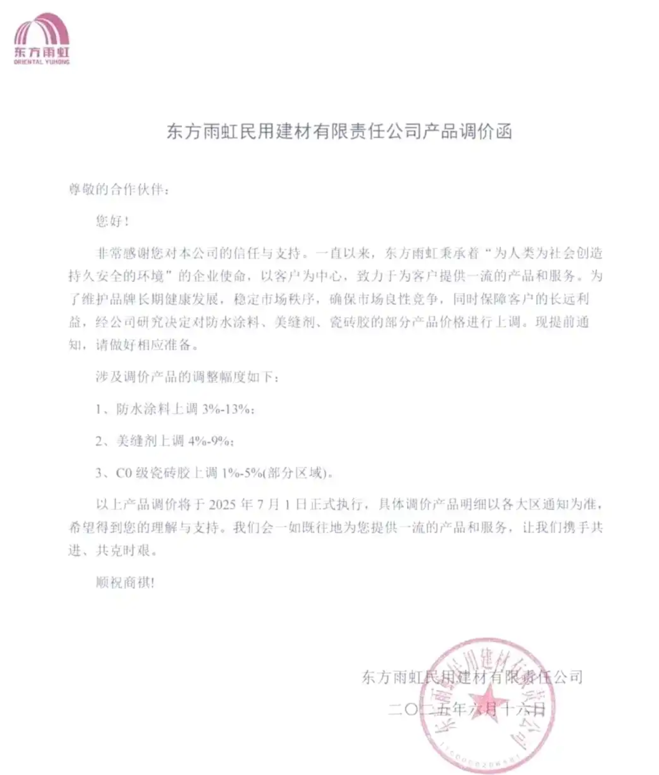 近日,东方雨虹(002271.SZ)的全资子公司东方雨虹民用建材有限责任公司6月份发布的《产品调价函》,宣布自2025年7月1日起,对旗下部分或全线防水产品价格进行上调。