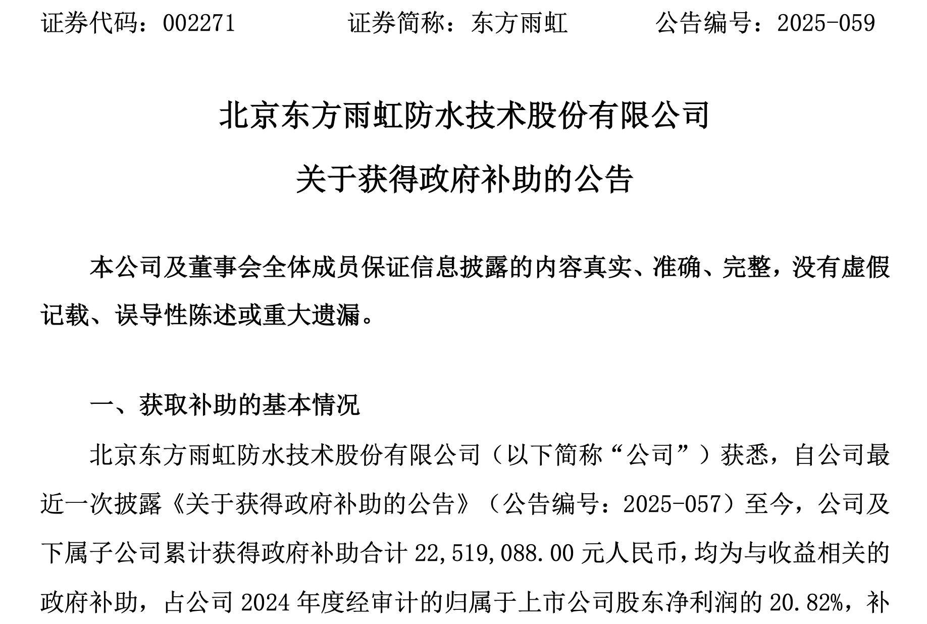 值得注意的是,这样的业绩还是在东方雨虹频繁得到政府补助的前提之下。据公告,自2025年1月至今,东方雨虹及下属子公司分别在2月、3月、4月和6月分获得相关的政府补助1337.99万元、1084.4万元、2451万元、1367万元、1133.4万元和2251.9万元的政府补助,合计超过9625万元,占到2024年归属上市公司股东净利润的89.12%。