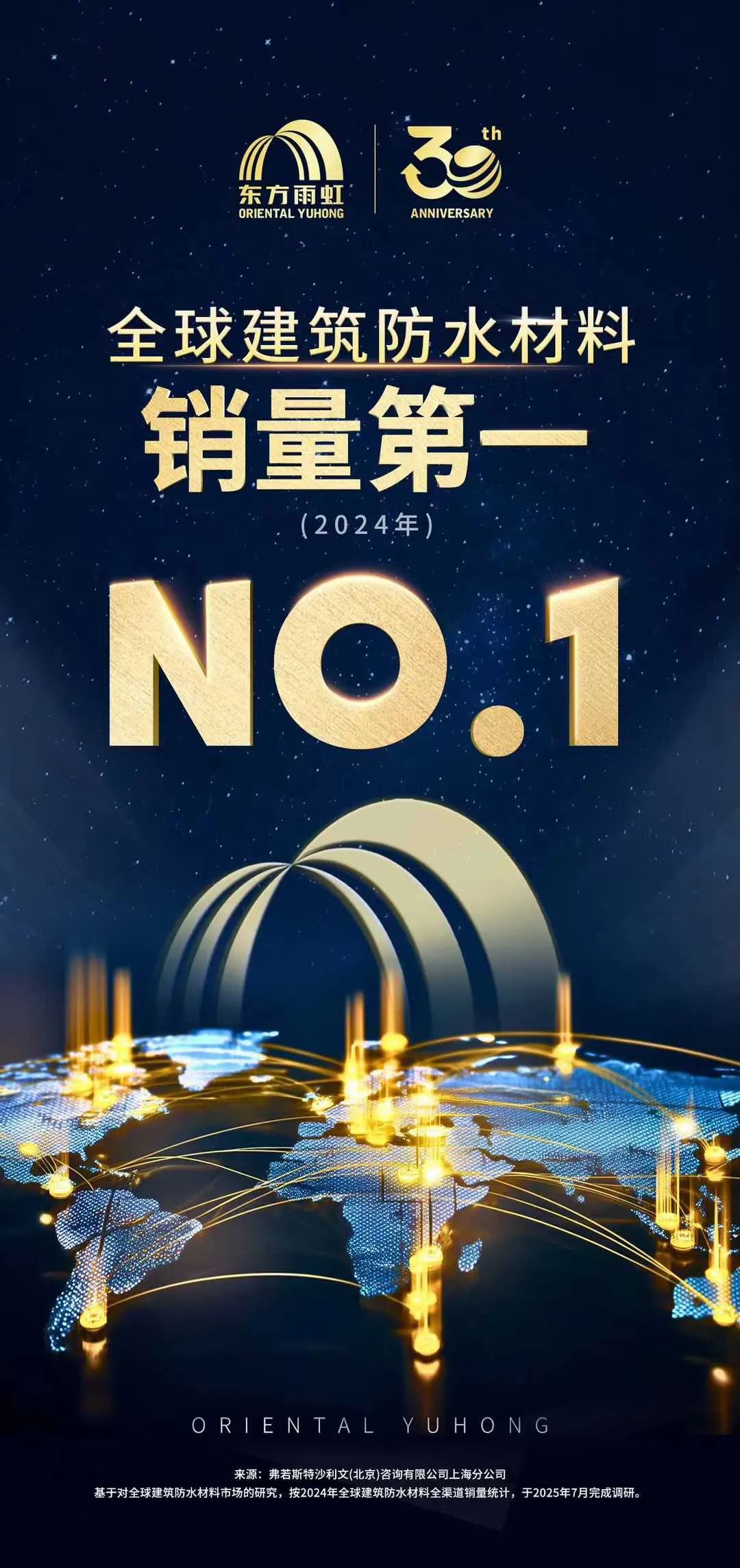在7月18日举行的东方雨虹成立三十周年庆典上迎来一个好消息:全球权威咨询机构弗若斯特沙利文(Frost Sullivan)授予东方雨虹市场地位认证:基于2024年销量数据,东方雨虹获得“全球建筑防水材料销量第一”的权威认证,这不仅是给东方雨虹三十周年华诞献上的最好礼物,也标志着东方雨虹在防水行业的地位再次提升到了一个新的高度!