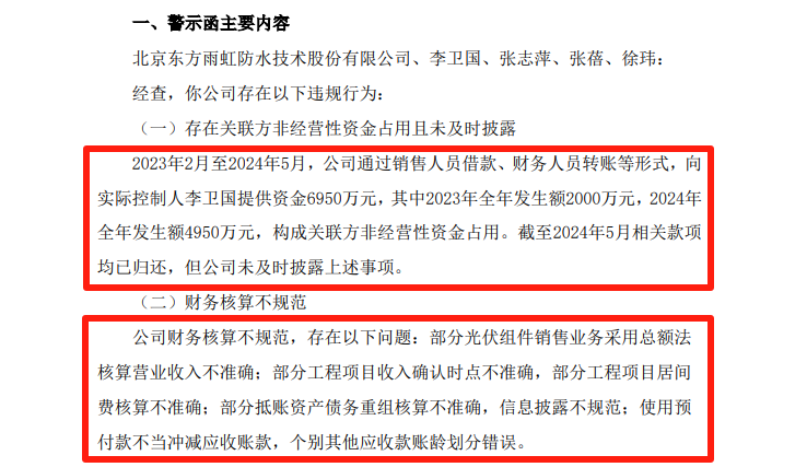 同时,本次北京证监局出具的警示函中也指出,李卫国存在违规占用东方雨虹非经营性资金的行为。