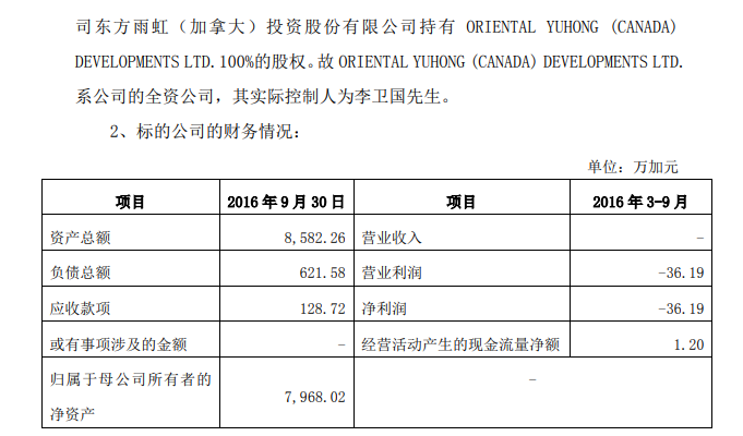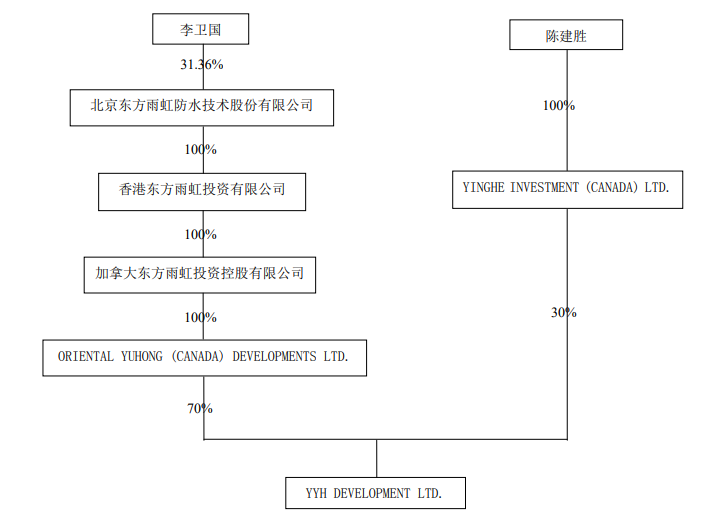 公告显示,标的公司成立于2016年3月,也在同一时间,标的公司与自然人陈建胜旗下公司YINGHE INVESTMENT (CANADA) LTD.共同成立合资公司 YYH DEVELOPMENT LTD.。而东方雨虹为双方合资公司约2.01亿元银行贷款,提供持股比例70%对应的贷款担保。