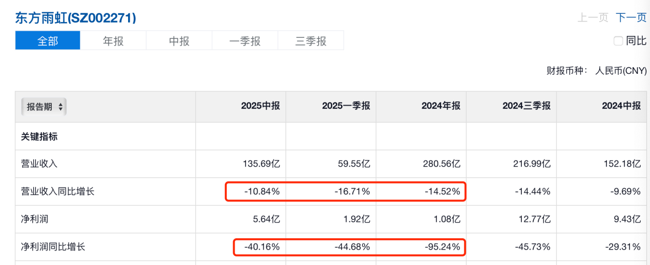 而另一方面,东方雨虹在债务压力之下,其高额分红则更令人意外。财报显示,2024年,东方雨虹实现营业收入280.56亿元,同比下滑14.52%;归母净利润则骤降至1.08亿元,同比降幅高达95.24%。进入2025年,其上半年营业总收入135.69亿元,同比下降10.84%;净利润5.64亿元,同比减少40.16%。