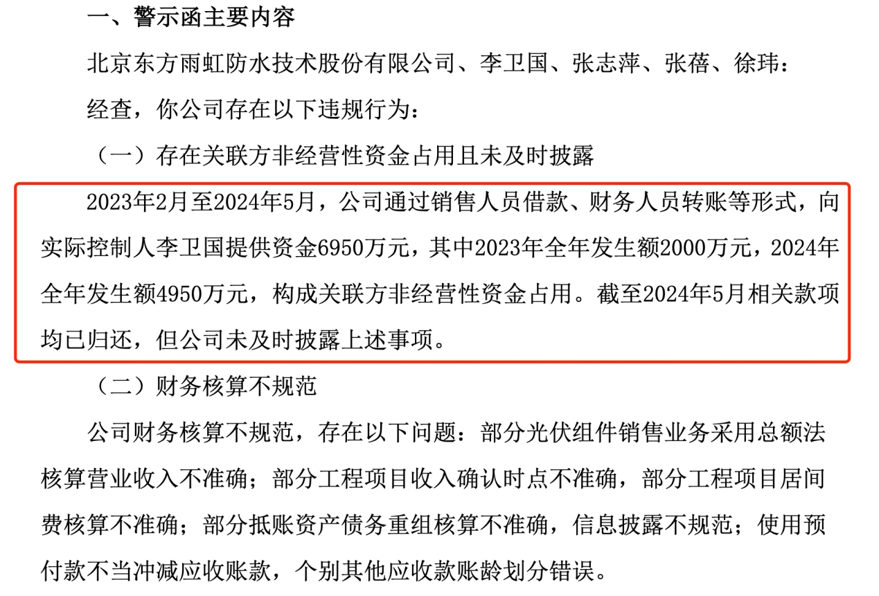 据警示函披露,2023年2月至2024年5月,东方雨虹通过销售人员借款、财务人员转账等形式,向实际控制人李卫国提供资金6950万元,其中2023年全年发生额2000万元,2024年全年发生额4950万元,构成关联方非经营性资金占用。截至2024年5月相关款项均已归还,但东方雨虹未及时披露上述事项。