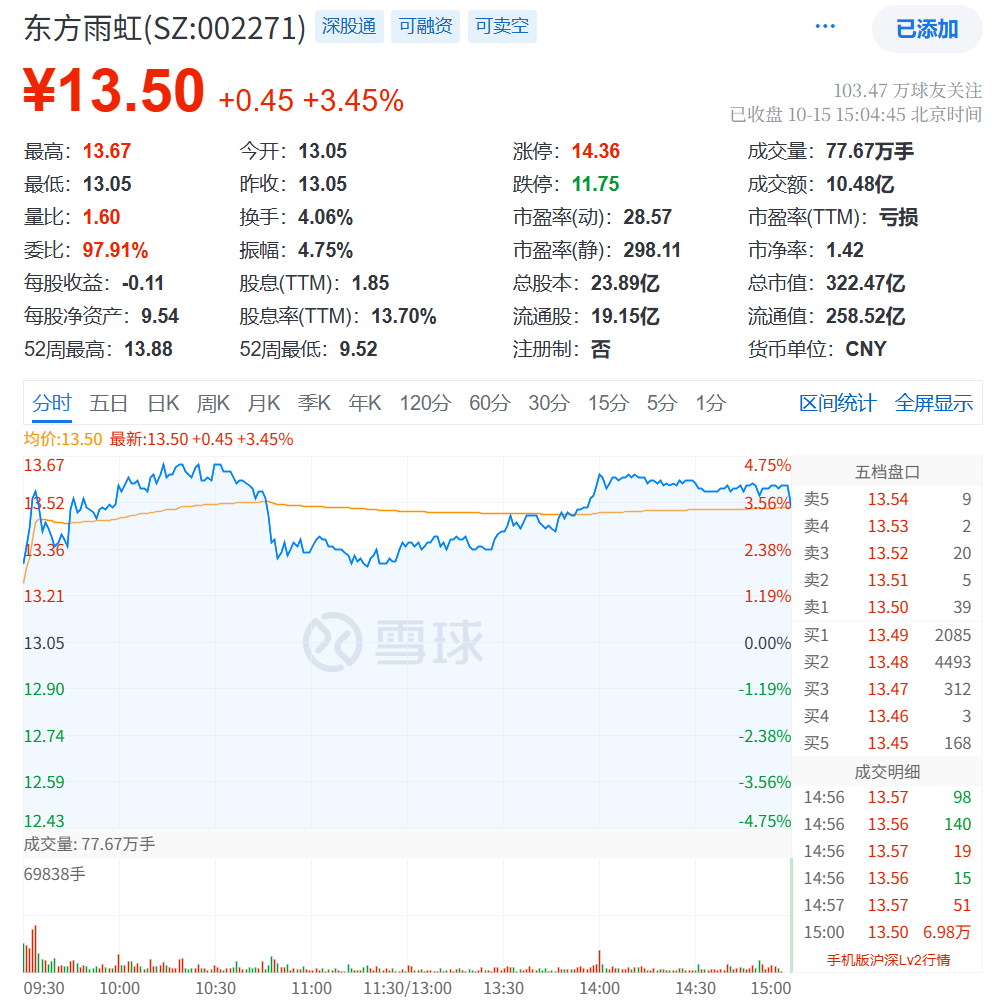 10月15日下午截止A股收盘,东方雨虹上涨3.45%,当日成交额10.48亿元,总市值为298.11亿元!