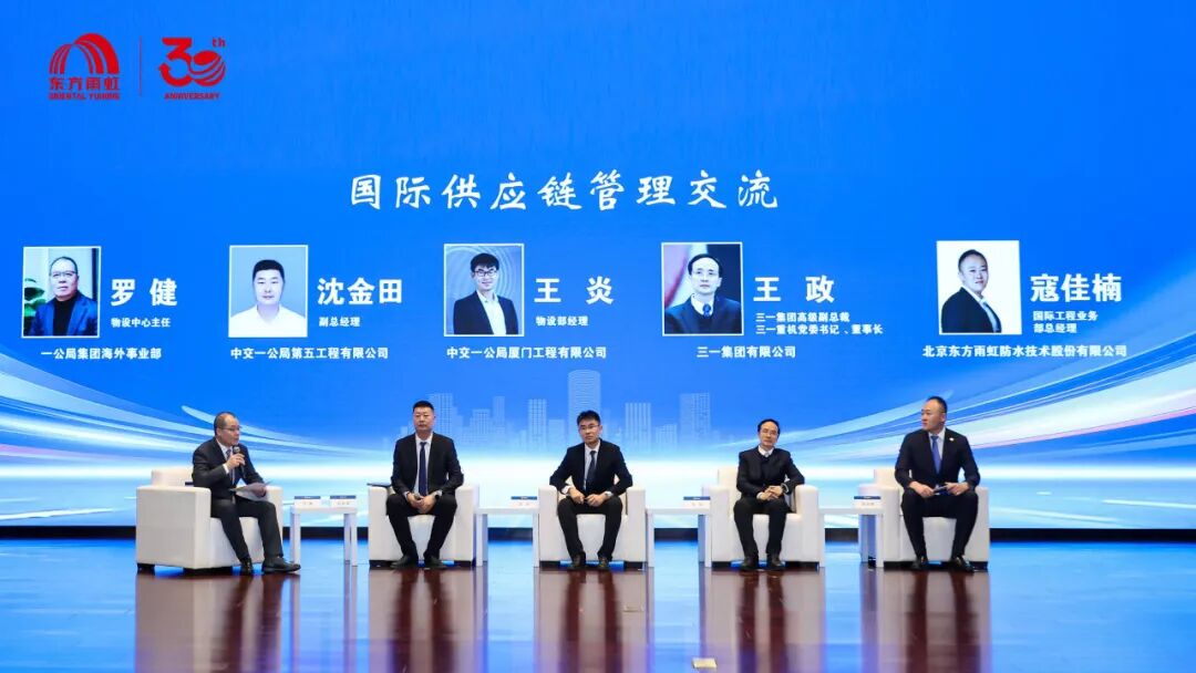 高层对话环节由中交一公局集团海外事业部物设中心主任罗健主持,围绕“构建有韧性的国际供应链体系”与嘉宾进行深度研讨。中交一公局五公司副总经理沈金田、厦门公司生产运营中心物设部经理王炎、三一集团高级副总裁、三一重机党委书记、董事长王政,以及东方雨虹国际工程业务部总经理寇佳楠等代表参与对话,共同为全球供应链抵御风险、实现稳健发展提供思路。
