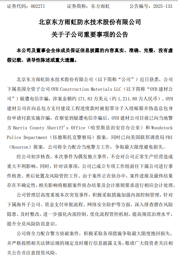 在公告中,东方雨虹称公司下属美国全资公司OYH Construction Materials LLC(以下简称:OYH建材公司)近日疑似遭遇电信诈骗,并已向当地警方以及美国联邦调查局FBI报案。