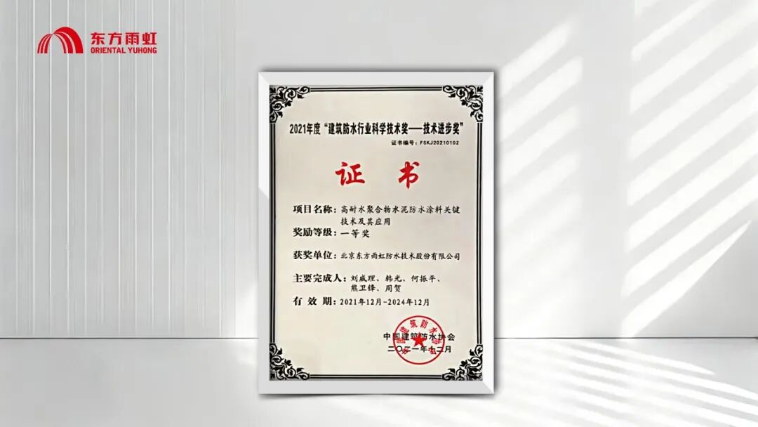 这一专利产品攻克普通水性防水涂料无法长期耐水的技术难题,拓宽聚合物水泥防水涂料应用领域。以此为基础,东方雨虹积极拓展高耐水聚合物水泥防水涂料关键技术及其应用,相继开发“高耐水聚合物水泥防水涂料蓄水工程内壁防水系统”“建筑地下侧墙防水系统”“地下综合管廊复合防水系统”等配套系统,并主持制定《高耐水聚合物水泥防水涂料施工技术规程》。相关成果于2021年12月荣获2021年度“建筑防水行业科学技术奖—技术进步奖”一等奖。