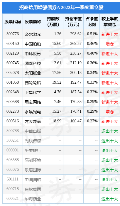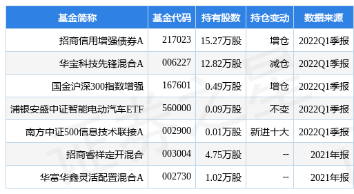 根据2022Q1季报基金重仓股数据,重仓该股的基金共5家,其中持有数量最多的基金为招商信用增强债券A。招商信用增强债券A目前规模为1.31亿元,最新净值1.0468(4月22日),较上一日下跌0.04%,近一年上涨1.74%。该基金现任基金经理为滕越。滕越在任的公募基金包括:招商民安增益债券A,管理时间为2020年3月6日至今,期间收益率为6.6%;招商添浩纯债A,管理时间为2020年9月10日至今,期间收益率为7.16%;招商盛合灵活混合A,管理时间为2021年7月8日至今,期间收益率为-3.42%。