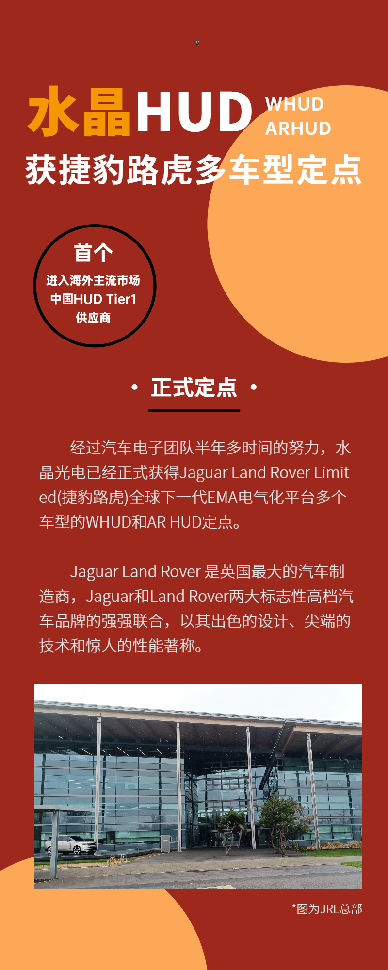 水晶光电获Jaguar Land Rover多车型HUD项目定点