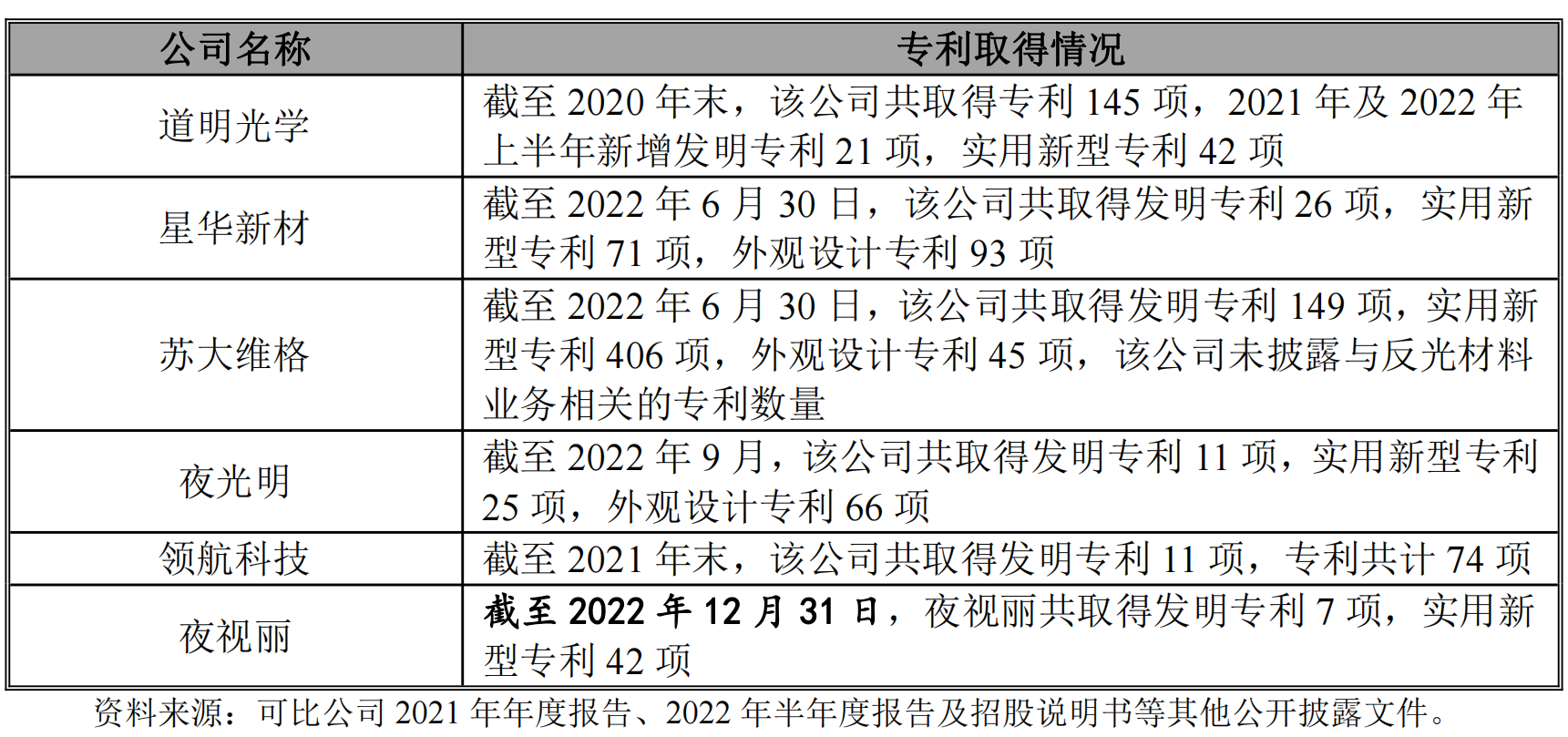 对于专利数量较同行少,夜视丽在招股书中解释原因称,夜视丽与行业内较为领先的道明光学和星华新材相比,营业收入规模、净资产规模、人员规模等显著较小;夜视丽历史上未充分重视专利申报工作,对公司已经在研发中形成的可申报专利技术的相关产品、工艺总结提炼不足,因此未能及时取得相关专利。近两年,公司已充分提高专利成果转化意识,越来越重视专利申报工作,目前正在积极申请专利授权。