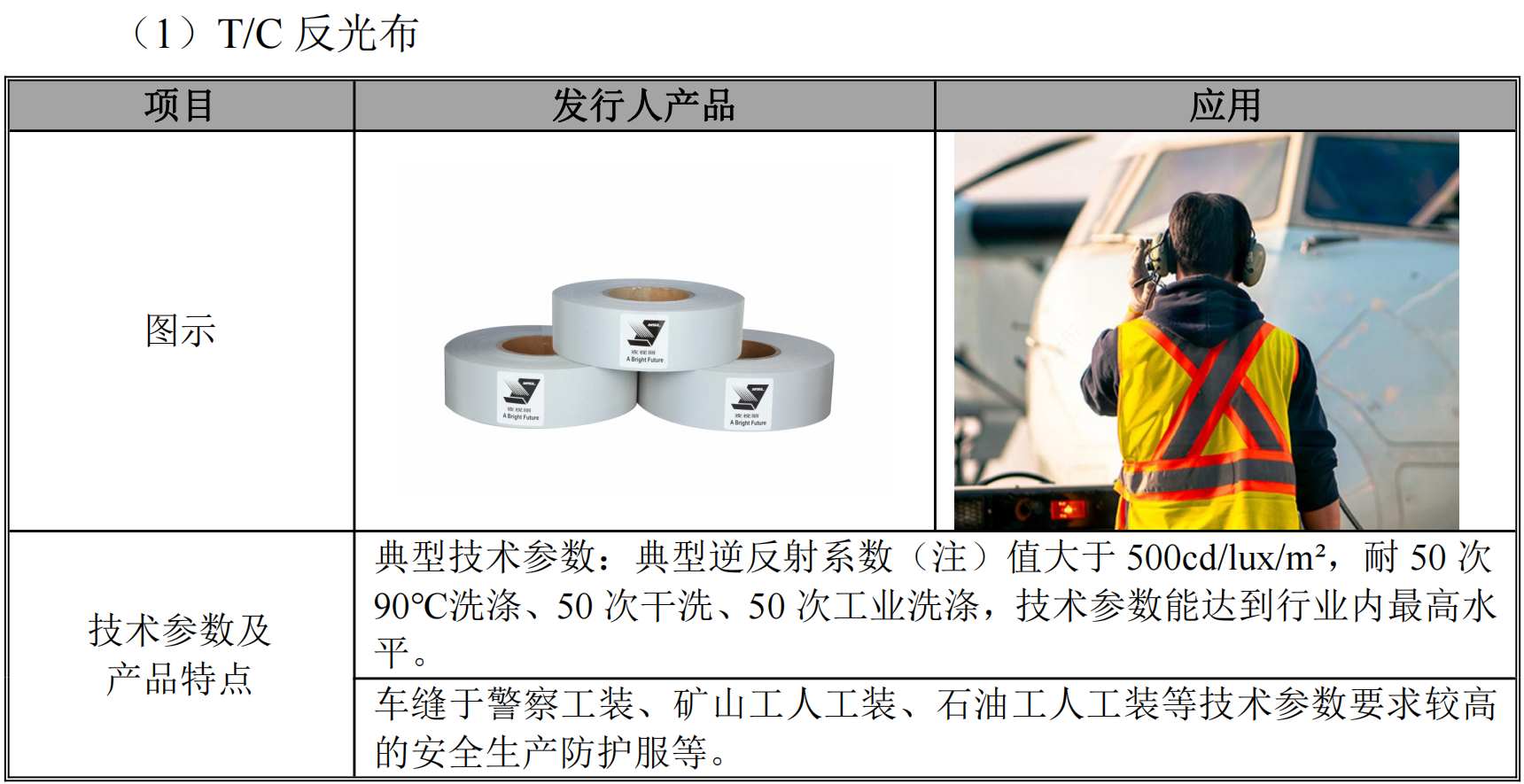 夜视丽主要从事反光材料及其制品研发、生产和销售,主要产品包括多种规格、用途的反光织物和反光膜产品,其中反光织物产品主要应用于职业安全防护和个人安全防护领域,反光膜产品主要应用于交通标志牌、车牌、广告标志牌等道路交通安全及公共安全领域。