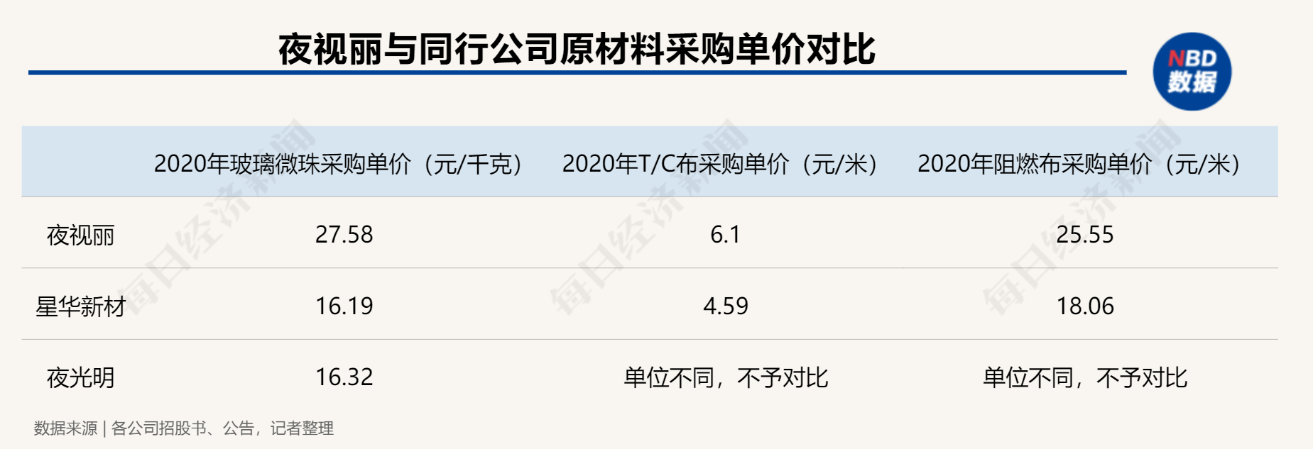 拆解夜视丽产品价格的构成可以看到,其原材料成本也高于同行。《每日经济新闻》记者挖掘了夜视丽与同行可比企业星华新材、夜光明的同时期同一款原材料的采购单价,发现存在较大差异。