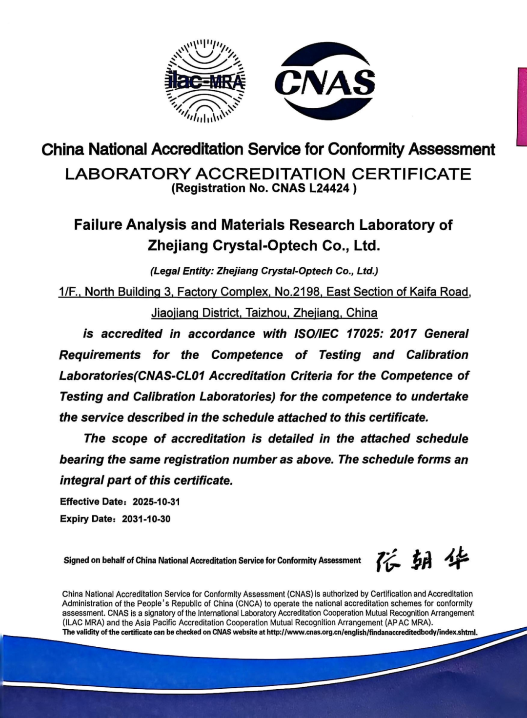 2025年10月31日, 水晶光电 失效分析与材料研究实验室(以下简称“实验室”)正式通过 中国合格评定国家认可委员会 (CNAS)评审,取得ISO/IEC 17025检测实验室认可证书。该认证标志实验室在技术能力、管理体系、数据准确性及服务质量等方面已达到国际通行标准,其检测结果将被全球100余个国家和地区签署国际实验室认可合作组织(ILAC)互认协议(MRA)的机构承认。此次认证进一步彰显了企业核心技术创新力与综合竞争力,为深耕国际市场筑牢品质根基。
