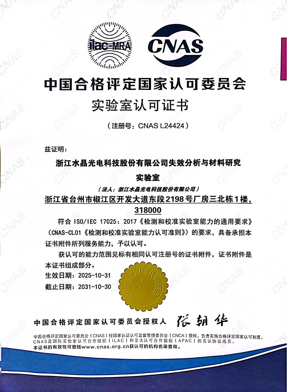 2025年11月, 水晶光电 失效分析与材料研究实验室凭硬核实力,顺利通过 中国合格评定国家认可委员会 (CNAS)严苛审核,正式获颁CNAS认可证书。这标志着实验室检测能力与服务质量已接轨国际标准,彰显了企业核心技术创新力与综合竞争力,为深耕国际市场筑牢品质根基”。