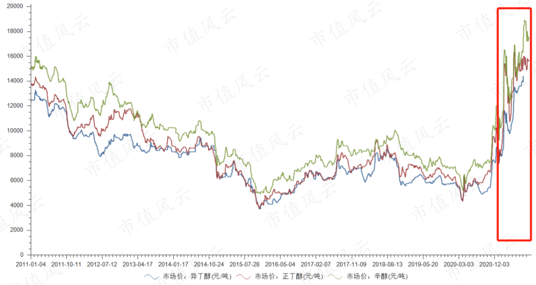 比如,占华昌化工多元醇产能40%的辛醇,2021年6月末市场价格为1.59万元/吨,较年初价格1.18万元/吨上涨34.7%,已是2020年6末价格(7,650元/吨)的2倍。