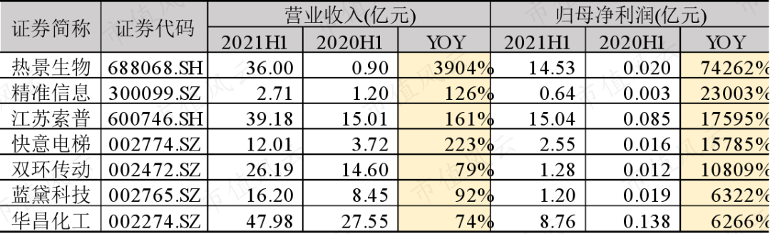 如此夸张的增幅,风云君数了数,A股中今年上半年营业收入和归母净利润增幅均大于华昌化工的上市公司,只有热景生物(688068.SH)、精准信息(300099.SZ)、江苏索普(600746.SH)、快意电梯(002774.SZ)、双环传动(002472.SZ)和蓝黛科技(002765.SZ)。