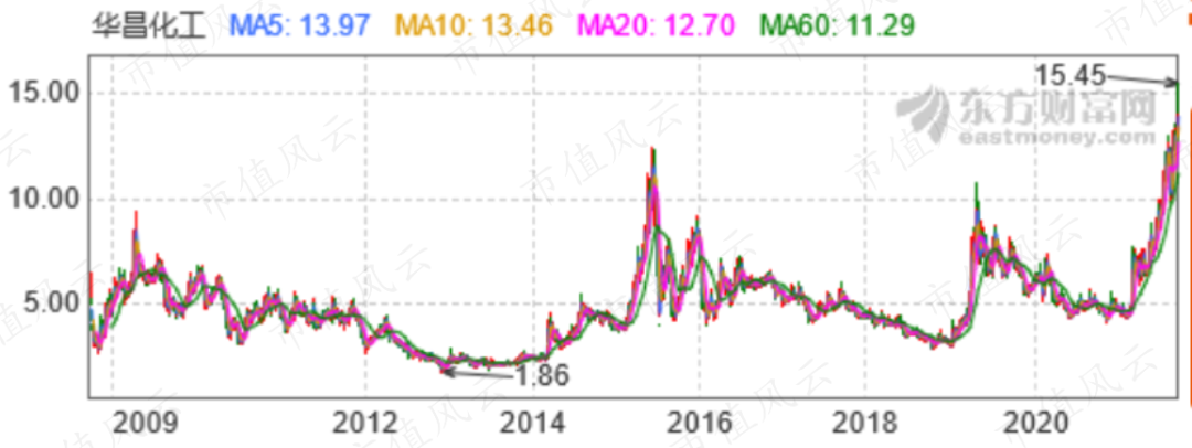 今年以来,在化工强周期和“氢能源”概念的双重叠加下,华昌化工的股价再次起飞,盘中最高价一度来到15.45元/股,创下了公司上市13年以来的新高。