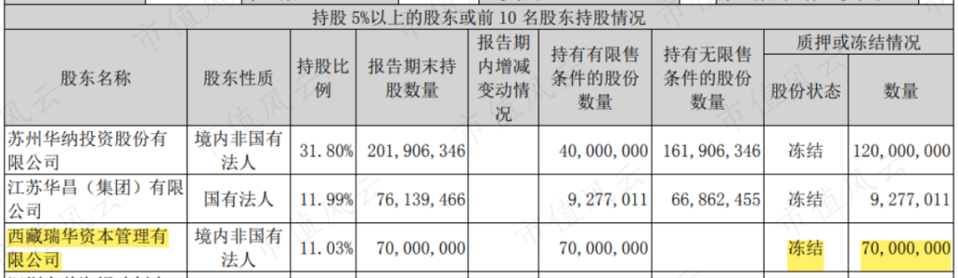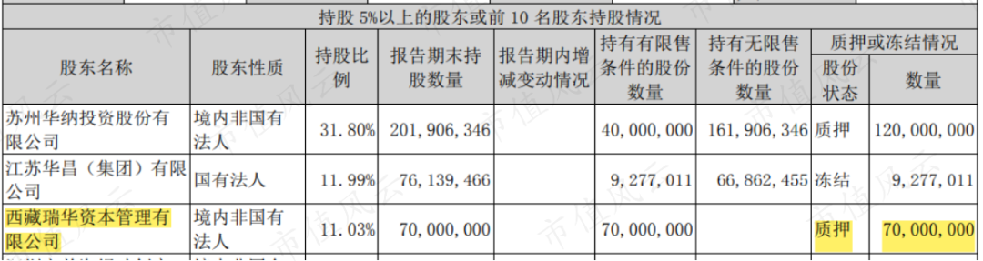 西藏瑞华通过参与2015年非公开发行成为华昌化工的第三大股东。2016年末、2017年末,西藏瑞华均持有华昌化工11.3%股份,此时因股票尚未解禁西藏瑞华将持有的全部华昌化工股份进行了质押。