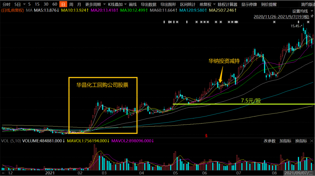 受公司股价走高、分配股利等因素影响,华昌化工于6月4日将回购股价上限最后一次调整至7.4元/股。但实际上,自从今年5月7日以后,华昌化工的股价就再也没有下过7.5元/股。