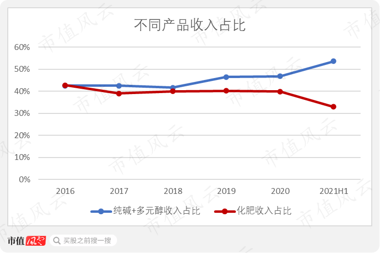 近五年华昌化工的业务重心从纯碱转移至化肥,如今再次转为多元醇。2021年4月,华昌化工公告拟投入12亿元新建30万吨多元醇及配套设施项目,以实现未来精细化工业务销售收入保持在总营收50%以上的目标。