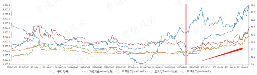 受下游光伏玻璃产能扩张、增塑剂行业需求旺盛等影响,2021年纯碱和多元醇的市场价格曾一度暴涨,一路攀升。