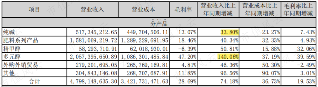 在华昌化工固有的各类产品中,纯碱和多元醇业务逐渐取代化肥,成为公司业绩和毛利的主要增长来源。