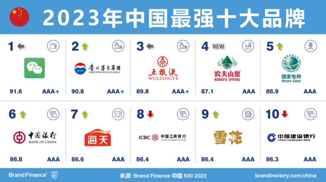 此外,Brand Finance也公布了“2023年中国最强十大品牌”,微信蝉联了中国最强品牌。贵州茅台集团、五粮液、农夫山泉、国家电网、中国银行、海天、中国工商银行、雪花、中国建设银行一同入选。